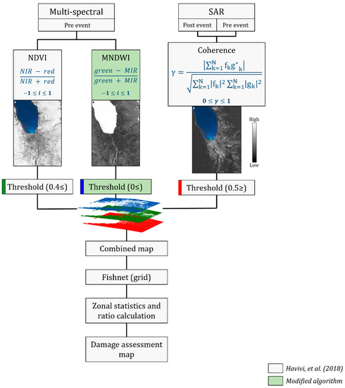Havivi et al. [1] proposed a damage assessment algorithm aimed at rapidly mapping the damage in urban environments following earthquakes. The algorithm uses combined SAR and optical images, following the outline in Figure 1.
