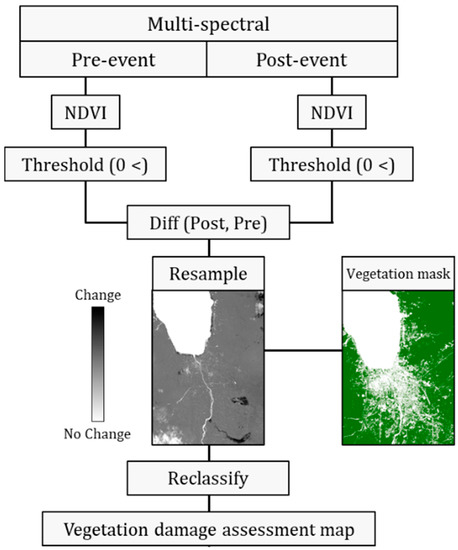 Vegetation damage assessment process outline. Light shades in the difference map represent stable vegetation areas with no or slight changes and dark shades represent vegetation areas with changes.