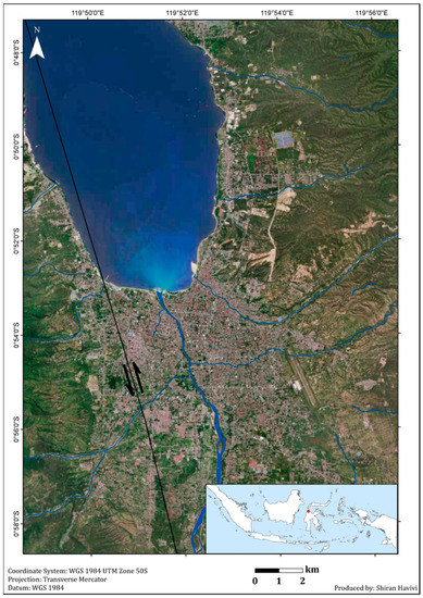 - Jaya, A.; Nishikawa, O.; Jumadil, S. Distribution and Morphology of the Surface Ruptures of the 2018 Donggala–Palu Earthquake, Central Sulawesi, Indonesia. Earth Planets Space 2019, 71, 144. [Google Scholar] [CrossRef]