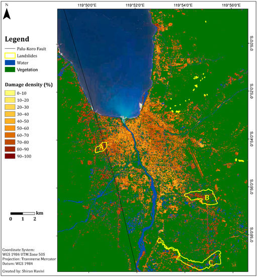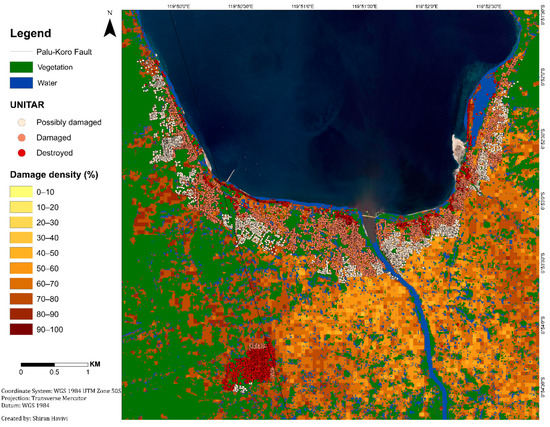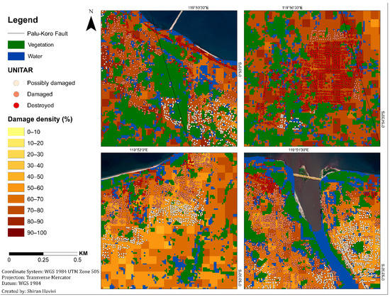 Figure 5 shows the damage assessment map with a cell grid size of 50 m produced by the integration of three threshold maps: InSAR coherence, NDVI, and MNDWI maps. This map (Figure 5) provides information about the zones affected by earthquake and tsunami events, as well as the following liquefication. A damage density of 100% indicates total destruction. Dark colors represent a high probability of damage, whereas light colors represent a lower probability of damage [1]. Green represents vegetation areas, and blue represents water bodies.