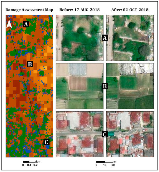 According to the damage assessment map (Figure 5), along the fault line up to a distance of 150 m (this was measured manually by visual assessment), a high level of damage (dark shades) was clearly observed from both sides, east and west (Figure 5 and Figure 6), in Palu city, and its surroundings. This high level of damage was attributed to co-seismic horizontal ground displacement (N-S component) of 4–7 m [41]. Along this fault line, three LULC scenes were examined from the east side: a built-up area, natural vegetation, and agricultural fields (Figure 6). The three insets in Figure 6, which were straight before the earthquake, show the displacement triggered by fault movement in these scenes.
