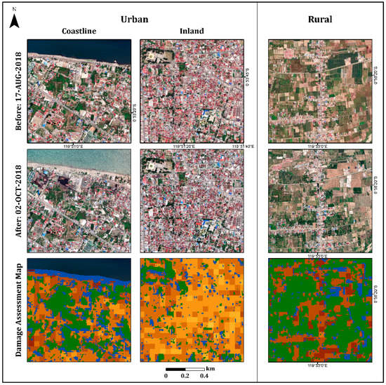 In the urban area, the damage assessment map displayed less damage (light colors) in the inland region than in the coastal region, as expected (Figure 7). Refs. [38,39,42,43] displayed similar results, showing that most of the damage occurred along the Palu city coastline, where most of the buildings were washed away by the tsunami, and buildings inland were affected by the earthquake but not completely destroyed. Moreover, this map displayed the differences between the damage levels of the urban areas (coastline and inland regions) and the rural areas. As can be seen in Figure 7, the rural area displayed higher levels of damage (mostly darker shades) than the urban area, which displayed a variety of damage levels. These findings were further validated by high-resolution (50-cm spatial resolution) optical images recorded on 17 August (pre-event) and 2 October (post-event) 2018, using DigitalGlobe (https://www.digitalglobe.com/ecosystem/open-data/indonesia-earthquake-tsunami, accessed on 1 January 2022) (Figure 7).