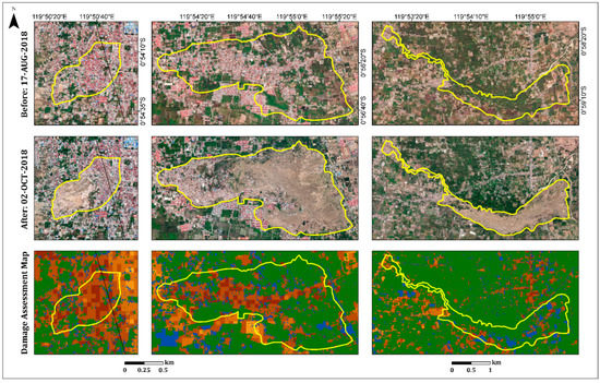 Figure 14 shows the overall damage to the three villages, Balaroa, Petobo, and Jono Oge, in the built-up and vegetation areas. Most of the vegetation in these villages was severely affected (red color) by the flow slides. No damage or very slight damage was found mostly outside the flow slide area (yellow polygons) and very little damage was found inside these areas.