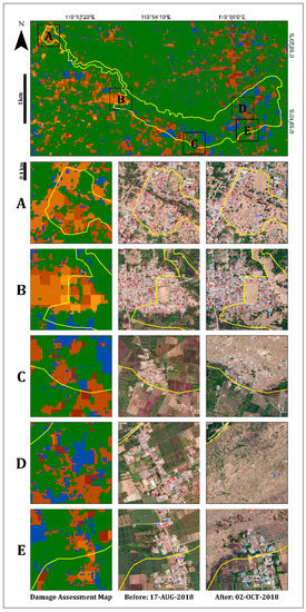 Zoomed in damaged built-up areas in Jono Oge village (subfigures A–E) resulting from the second hazards, liquefication and flow slide. Pre-event optical image (17 August 2018), post-event optical image (2 October 2018), and the damage assessment map (see legend in Figure 5).