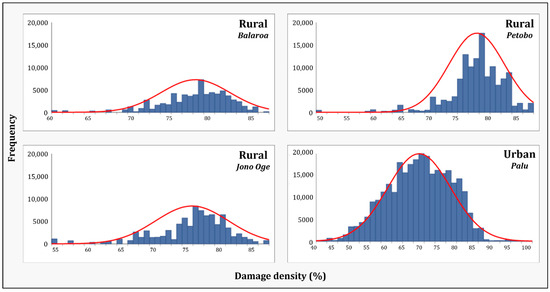 Table 3 summarizes the damage assessment results of built-up areas in urban and rural environments. None of these areas received a damage level value of zero. Thus, built-up areas in both environments experienced changes following the earthquake event. The lowest received damage level value (meaning less damage—Min) was in the urban environment (38.8). In comparison, the damage levels in rural areas started with higher values. Balaroa had the highest initial value (59.4). The highest damage level value (Max = 100) was only found in the urban environment (total destruction). The mean and median values in the urban environment were the lowest(both approximately 66). These indices were higher for the three rural areas (75–78). Likewise, the majority value in the urban environment was the lowest(65.4) and the minority was the highest (88.6). As for the rural areas, the majority values were 75–78 and the minority values were 65–80. Namely, there were more low damage values and fewer high damage values in the urban area than in rural areas. All of the histograms of the urban and rural environments (Figure 12) had negative skewness values, showing a slight tendency to the left (left-skewed distribution). Nevertheless, the distribution of the urban environment values was less spread out (Kurtosis = 2.6) compared to that of the rural environment values (5–8). These indices indicated that the urban area damage level values were almost normally distributed, showing symmetry on both sides (skewness = −0.2). These measurements indicated that built-up areas in the rural areas experienced more damage than the urban area.