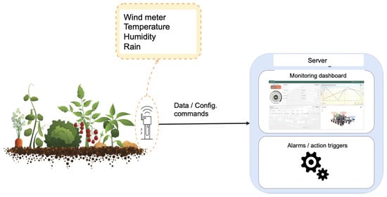 Figure 1 illustrates the target system that includes sensors to report real-time readings of wind speed, rain quantity, humidity, and temperature. Sensors are connected to the control server by means of a well-defined interface. The server receives real-time data; then, it processes these data, and generates configuration commands back to the IoT nodes.