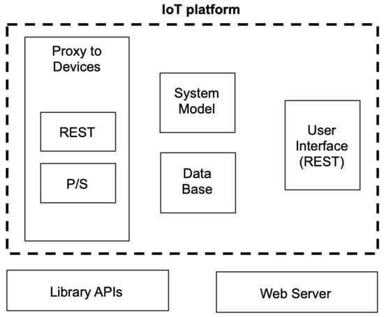 The interface to IoT devices (contained inside the Proxy to Devices block) is performed essentially by means of two different protocols: REST [9] (REpresentational State Transfer) or publish–subscribe. There are a number of particular instantiations and libraries that realize both of them. Interaction through REST provides a pure client–service model, and it improves compatibility with web protocols; whereas interaction by means of publish–subscribe models constitute a powerful n to m communication scheme based on a consumer–producer model.