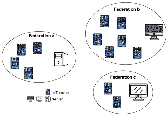 The target IoT system is based on the existence of federations of nodes (see Figure 3) that include a number of smart IoT devices and an associated server. Federations have been applied extensively in distributed systems and in more recent computing paradigms such as fog [5]. One of the reasons is the inherent ordering that favors controllability and accountability of nodes; this is particularly useful in the case of errors or missfunctions, as it becomes simpler to trace back until reaching the fault source.