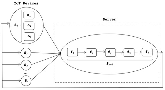 Figure 5 illustrates the service-based definition with n smart IoT devices that are connected to a server. At the top level, Figure 5 shows the service in the system. This sample model shows a simplified version containing only one service per IoT node. The model easily scales to more complex service configurations.