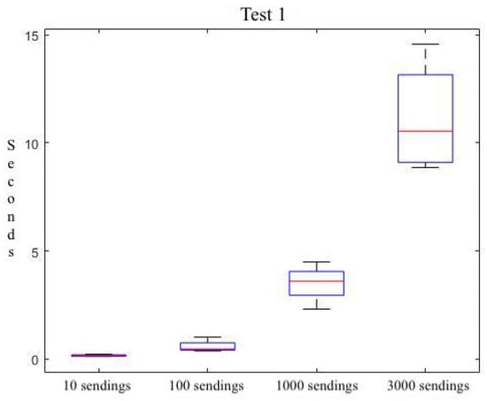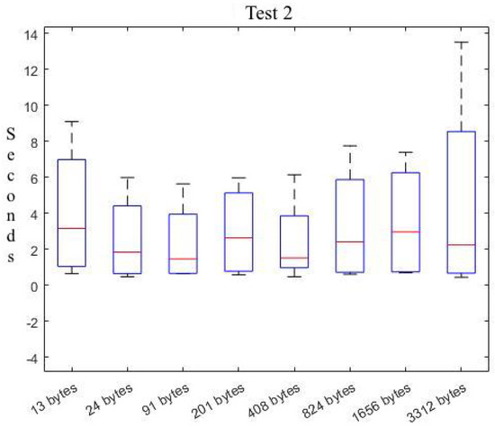 Additionally, we have designed and performed a second test on the temporal behaviour of our solution for the communication of different data sizes. It is important to recall that in the first test, we have explored the temporal behavior of our solution and have explored the limits and utilization boundaries of the underlying IoT platform. Then, this second test stays within the boundaries that allow the underlying IoT platform to function normally, as derived from the initial test.