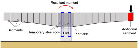 The free cantilever method (FCM) is a construction method for PSC bridges that does not install scaffolding systems under the bridge and completes the superstructure of the bridge by sequentially joining the segments to form a span by post-tensioning and balancing them left and right from each pier using special erection equipment. The FCM has advantages in terms of construction conditions and its period. As it does not use a shore or a scaffold, the bridge can be constructed under extreme conditions, such as in deep valleys or at sea. Furthermore, the construction period can be shortened in the case of using the precast concrete method, where manufactured girders are assembled at the construction site, rather than the in situ concrete method. Thus, the FCM is consistently used for bridge construction. However, considering the characteristics of the FCM, which joins segments from side to side, an unbalanced moment may occur owing to the load generated during construction, as shown in Figure 1.