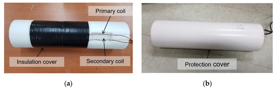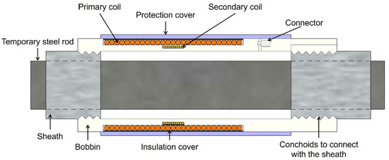 The EM sensor used in this paper is composed of a part for inducing voltage to generate magnetic fields and a part for measuring it, as shown in Figure 2. The coils are wound on the outer surface of the bobbin, and insulation covers are wrapped between each coil. The coils pulled out of the bobbin are connected to the data-acquisition device through connectors. A protection cover is on the outermost surface of the EM sensor, and it protects the sensors from the concrete pouring. For the attachment of the EM sensor to the sheath around the temporary steel rod, conchoids are on the inner surface of both ends of the bobbin.