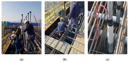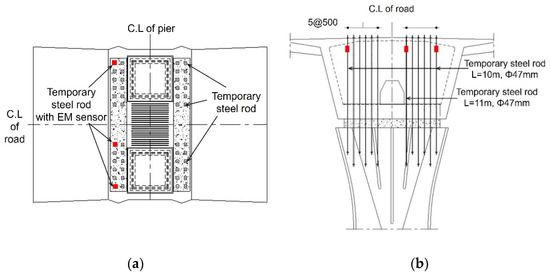 Figure 5 shows the location of the temporary steel rods and the EM sensors. Forty-eight steel rods were installed in the pier at intervals of 500 mm from each other, and they were connected from the pier to the pier table. The EM sensors were installed on three steel rods, two of which were connected to the steel rods with the length of 10 m; the other one was connected to the steel rod with the length of 11 m.