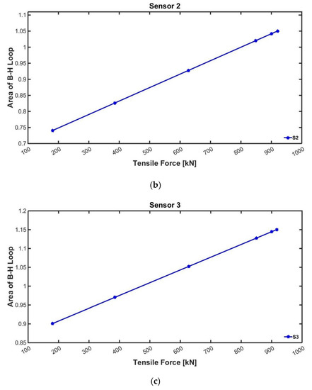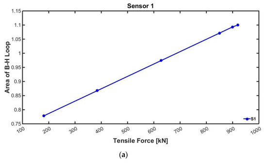 The initial value calibration results using the EM sensors are shown in Figure 7. The tensile force was measured six times by progressively increasing the prestressing force to 180 kN, 383 kN, 628 kN, 849 kN, 900 kN, and 915 kN. The area of the magnetic hysteresis curve was measured simultaneously with the prestressing process.