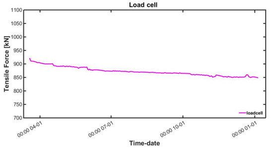 The results of measuring the tensile force using the load cell are shown in Figure 8. The load cell data were used as the absolute values of the force introduced to the temporary steel rods. In addition, the results of the change in area of the magnetic hysteresis curve measured using the embedded EM sensors and the change in field temperature are shown in Figure 9.