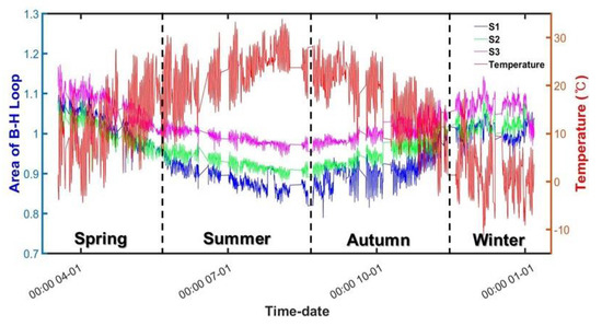 During the measurement, the input voltage remained constant to a 0.02-Hz triangular wave of ±3 V. Although the voltage input value to the sensor remained constant, the area decreased as summer approached and then increased again as winter approached. The results of Figure 9 indicate that the area of the magnetic hysteresis curve measured by the embedded EM sensor exhibits an opposite trend to that of the temperature change.
