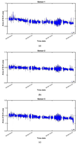 B–H loop area changes of sensors after temperature compensation: (a) Sensor 1; (b) Sensor 2; (c) Sensor 3.