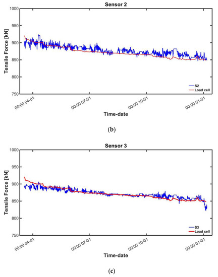 Estimated tension after temperature compensation and actual tension: (a) Sensor 1; (b) Sensor 2; (c) Sensor 3.
