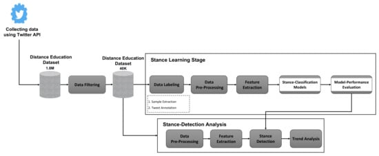 In this study, I implemented a three-stage methodology to analyze the Saudi public opinion regarding distance education during COVID 19 shown in Figure 1, which was adapted from []. In the first stage, data collection, the Twitter application programming interface (API) was used to collect relevant data. The second stage, stance learning, consisted of five steps: data labeling, data pre-processing, feature extraction, stance classification models, and model-performance evaluation. The final stage, stance detection analysis, is where I analyzed the trends and patterns related to the Saudi public opinion regarding distance education. The following subsections explain the methodology stages in more detail.