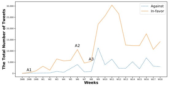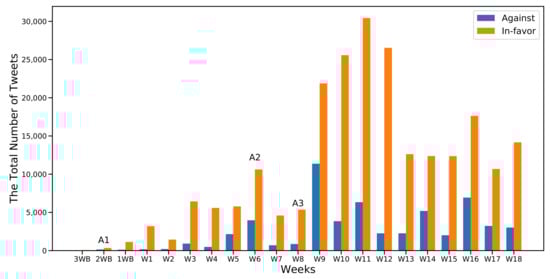 The SVM model with the best performance score was applied to the cleaned tweet dataset to classify each tweet into either the In-favor or Against classes regarding their stance on distance learning. Because most of the events that the MOE had announced included start and end times of the suspension of schools and universities (i.e., they involved a switch regarding distance learning) and were bounded by a certain number of weeks, the analysis was performed on a week-by-week basis that was divided into two parts. The first part of the analysis included three weeks before the academic year (3 WB, 2 WB, and 1 WB) and the 18 weeks of the first academic semester. The second part of the analysis included the two weeks of the half-term holiday (HTW1 and HTW2) and the 11 weeks of the second academic semester.