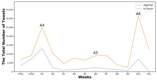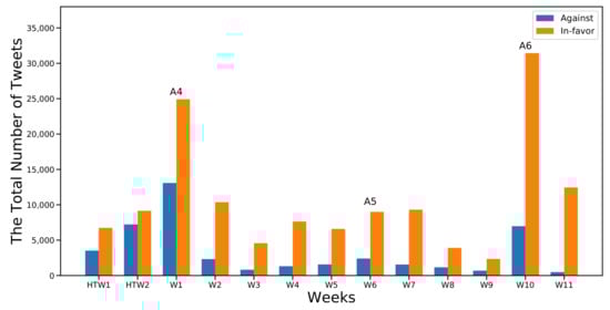 After the announcement of event A4 in W1 of the second semester, the percentage of Against stances decreased by (the In-favor class reached out of a total of 38,012). A4 was the event regarding the continuation of school suspension and distance learning until the tenth week of the second semester. Students, at this time, had been engaged in distance learning since the start of the academic year in September (fmy months). The total number of tweets dropped to 12,000 at W2 and gradually continued to decrease until the occurrence of event A5 at W6. Despite the decrease in the total number of tweets, there was a slight increase in the percentage of the In-favor class, which reached in W5 after the announcement of event A5. It increased by and in W6 and W7, respectively.
