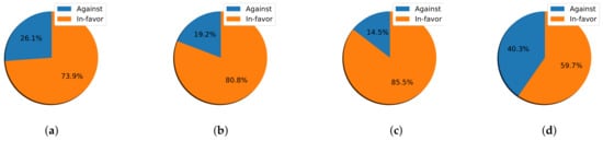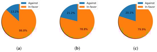 After the announcement of A4, the In-favor stance tweets increased by (Figure 8a). This further increased by 6.9% and then by after the announcements of A5 and A6, respectively. A5, announced at W6 of the second semester, declared the continuance of distance learning until the end of the 2020/2021 academic year. People, by this time, had already been using distance learning for approximately six months and had presumably become used to it and more familiar with the imposed situation.