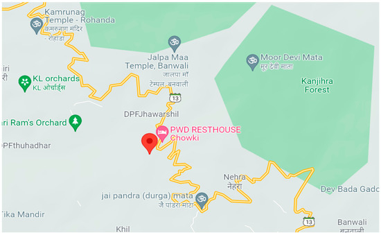 Several primary and secondary pollutants affect IAQ levels. However, their concentration varies depending upon the geographical area under consideration. The authors focused on collecting real-time data on potential pollutants from a rural site in India. The preferred IAQ parameters for this study were PM10, PM2.5, CO2, CO, NO2, tVOCs, and along with these, two major thermal comfort parameters were also monitored: temperature and humidity. These eight parameters were selected out of many other crucial IAQ and thermal comfort parameters only after studying the environmental conditions of the target geographical area. Recommendations from air pollution experts in the area were also taken regarding the selection of parameters to address the field IAQ concerns. The hardware monitoring system was installed in the kitchen area of a home located in a rural village of Himachal Pradesh, where traditional heating and cooking practices are followed. The map of the selected monitoring site is provided in Figure 1. The major sources of pollution at this site are the fireplace that involves the burning of wood, cow dung, kerosene, dry grass, and traditional cooking practices. The detailed information on monitoring system design and parameter collection is provided in the subsections below.
