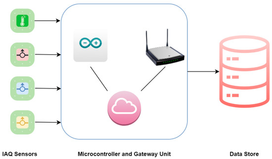 The authors used factory-calibrated sensor units to ensure reliable real-time data collection from the field environment. However, the authors also preferred conducting field reliability tests before deploying sensors in the field. For the DHT11 sensor, the reliability was tested in the laboratory against a standard instrument (Honeywell TM00X), whereas for the remaining three sensors, the manufacturer specified procedures were conducted to ensure stable performance. The hardware monitoring system was set to provide readings on-field pollutant concentrations after every 5 min, and the total duration of measurements was six months from 1 January 2021 to 30 June 2021. The general architecture of IoT based IAQ monitoring system is given in Figure 2.