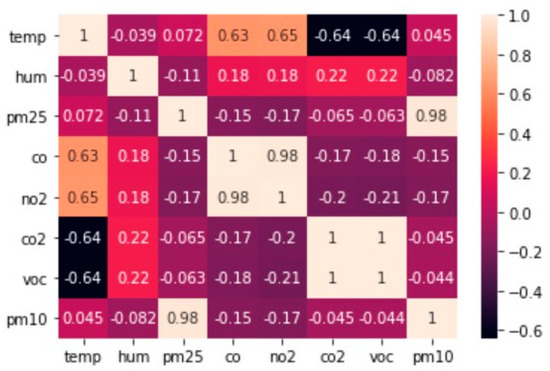 The literature states that environmental data are random in nature due to cyclic variations, seasonal variations, and irregular movements [31,32,33]. Other than this, due to the use of low-cost sensors, a considerable amount of measurement uncertainty and variability is also introduced to the field data [34]. Therefore, the authors decided to use a FIS to process the field data that is fuzzy in nature. The data was analysed on the basis of correlation between features. Figure 3 shows a correlation plot based on the Pearson Correlation method to describe the general distribution of data. The information obtained from correlation analysis will be further utilized in designing DFIST for IAQ prediction. After analysing the correlation response of variables, the authors used the k-fold cross-validation approach for data splitting, as suggested by [35,36]. The Naïve-Bayes based cross-validation was used to split data with 20% holdout on a total of 3695 samples; as a result, 2956 samples were left for training data and 739 for validation data [37,38,39]. The available dataset was further utilized for prediction model training and validation performance assessment.