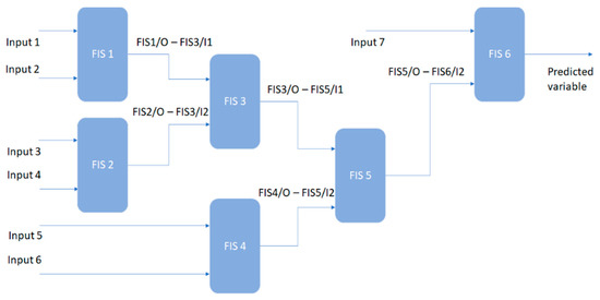 To design the proposed ADFIST model, the authors arranged multiple FIS in the form of an incremental tree. As the ADFIST is desired to provide a prediction for all IAQ parameters, a dynamic approach was followed for setting up input and output variables for particular instances. As there are seven input features, we have aggregated six FIS systems to accommodate all inputs; however, two inputs were given at one stage. The reason to use only two input and single output FIS per stage is to limit the number of rules that could further reduce the computational complexity at every stage [60]. The decision about the organization of input parameters at every stage was made based on the correlation between features and the response variable, as shown in Figure 3 [61,62,63]. In the first stage, the correlation between the response variable and all input features was tested, and then the correlation between features was analyzed. The general structure of DFIST is given in Figure 6 with 6 FIS at different stages, feeding two input parameters to one FIS module.