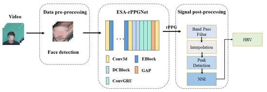 Proposed HRV analysis framework using ESA-rPPGNet.