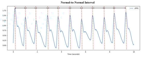 There are three steps in non-contact HRV analysis. First, the rPPG signal must be obtained from the facial video. Then, the peak time locations of the rPPG signal is obtained by the peak detection algorithm. By measuring the time interval between the peaks, these time intervals form a set of sequences, as shown in Figure 3. Finally, HRV analysis is performed through the time interval sequence.