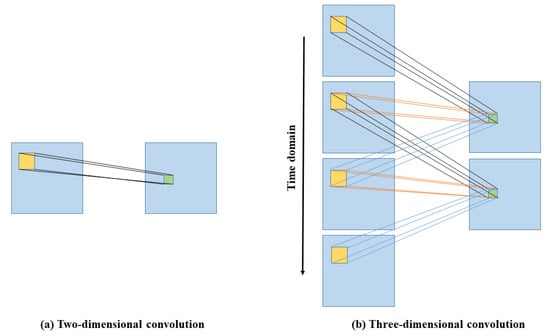 Due to the excellent spatiotemporal feature extraction capability of spatiotemporal networks, they play a vital role in many video-based tasks. 3DCNN, as a spatiotemporal network, has been widely used in video processing tasks because of its better video spatiotemporal feature extraction capability than 2DCNN [], as shown in Figure 4. Yu et al. first proposed a network constructed by 3DCNN in 2019, PhysNet [], which can recover accurate rPPG signals from original facial videos and evaluated the measurement metrics of LF, HF and LF/HF of HRV. In Yu’s method, the C3D network architecture is used for construction. The disadvantage of this network architecture is that the time complexity is very high, which makes it difficult for this kind of network to be applied to resource-constrained devices.