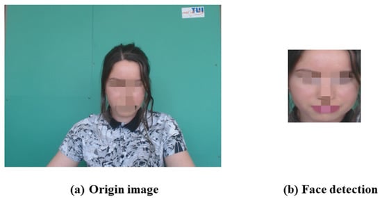 To reduce the noise caused by the irrelevant background and the motion artifacts in the videos, we use the face as the ROI for subsequent calculation. The face detection algorithm MTCNN [] is used to detect the face of the videos in the dataset, as shown in Figure 5. In order to improve the processing speed of face detection, after recognizing the face position coordinates of the first frame, we store them. The same face position coordinates are used for the next 10 frames, and then the algorithm performs face detection again and updates the face position coordinates, and so on.