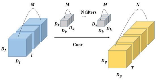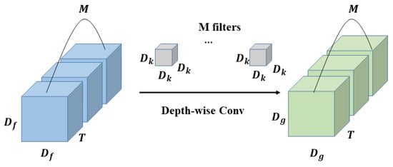 The calculation process of the standard 3D convolution is that the convolution kernels extract features from the input feature maps, and then combine the extracted features into new feature maps for output. As shown in Figure 6, the size of input feature maps is , where is the length and width of the input feature maps, T is the temporal dimension, and M is the number of input channels. The size of output feature maps is , where is the length and width of the output feature maps, T is the temporal dimension, and N is the number of output channels. The size of the filters is , which is composed of M convolution kernels. The length, width and temporal dimension of the convolution kernels are all . In the standard 3D convolution, the number of filters are the same as output channels, and the number of convolution kernels that compose the filter are the same as input channels.