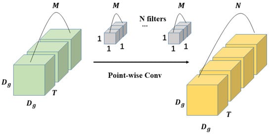 In point-wise convolution, filters composed of multiple convolution kernels are used to perform further feature extraction on the feature maps generated by depth-wise convolution. It is very similar to the standard 3D convolution process, except that the size of the convolution kernels that compose the filters used for point-wise convolution is all . After point-wise convolution, the feature maps generated in the previous step will be weighted and fused in the depth direction to obtain the final output feature maps of the depth-wise separable convolution. The calculation of 3D point-wise convolution is as follows: