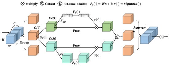 An overview of the proposed SA module. The C channels are divided into G groups and each group has C/G channels. “Split” means “channel split”. It adopts “channel split” to process the sub-features of each group in parallel. Each group is divided into two sub-features and each sub-feature has C/2G channels. means to use global average pooling (GAP) to generate channel-wise statistics; then, uses a pair of parameters to scale and shift the channel vector. means to use the sigmoid activation function to create a compact feature to guide more precise and adaptive channel selection. Group norm (GN) is adopted to generate spatial-wise statistics. “Fuse” means keep the tensor unchanged, directly as input. The two branches are then concatenated. After that, all sub-features are aggregated, and finally, SA utilizes a “channel shuffle” operator to enable information communication between different sub-features.