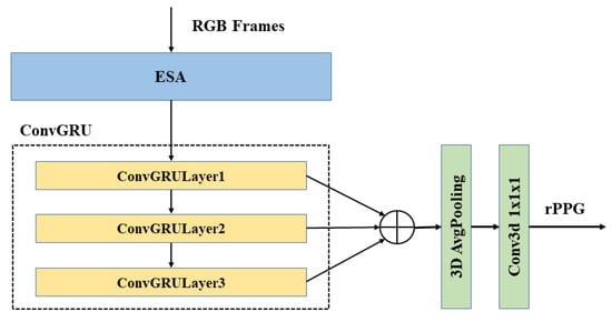 Through the feature extraction network ESA, rich temporal and spatial features are obtained. In order to further strengthen the network’s long-term spatiotemporal feature learning ability, ESA-rPPGNet introduces the ConvGRU module []. Three layers of ConvGRU are used in the end of the network; the output of each layer is fused, and then the spatial dimension is pooled through a 3D adaptive average pooling layer. Since ESA-rPPGNet is designed as a fully convolutional structure, the rPPG signal is finally obtained by 3D convolution with a convolution kernel size of 1 × 1 × 1.