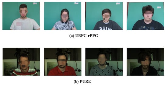 Two datasets are used in this paper, namely UBFC-rPPG [] and PURE []. The UBFC dataset was created in 2019 and contains 42 videos in total. The dataset uses an uncompressed 8-bit RGB format with a resolution of 640 × 480 to record the subjects’ facial video in the real environment. At the same time, the real-time PPG data of the subjects were recorded through the CMS50E transmission oximeter at 60 Hz. The PURE dataset was created in 2014 and contains a total of 60 videos. The dataset uses an eco274CVGE camera with a resolution of 640 ×480 to record 6 different activities (sitting, talking, rotating and moving head in four ways) of the 10 subjects’ facial videos at 30 fps. Meanwhile, the real-time PPG data of the subjects were recorded through the CMS50E transmission oximeter at 30 Hz. In the UBFC dataset we used, in order to reduce the impact of motion artifacts, the subjects kept as still as possible during recording. To increase task difficulty, subjects in the PURE dataset were recorded with head movements and talk. The examples of the two datasets are shown in Figure 12.