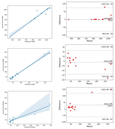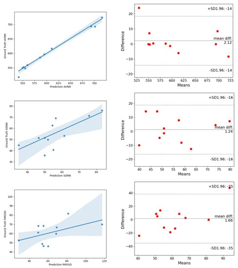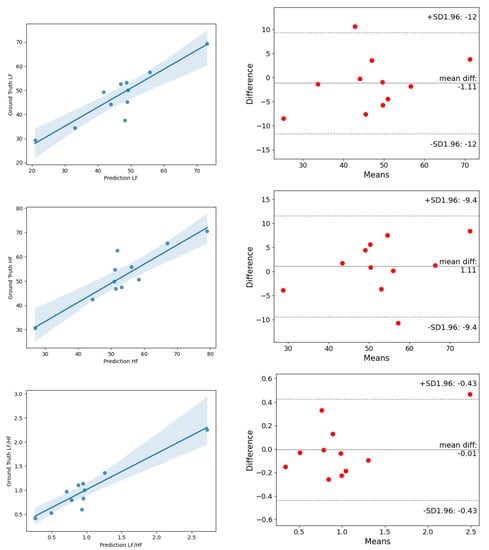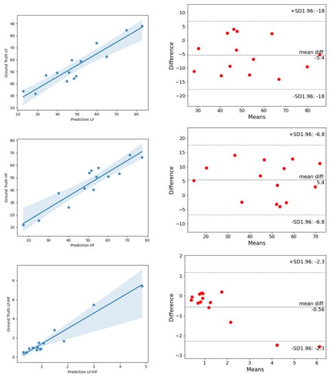 On the UBFC dataset, the estimated MAE of AVNN by ESA-rPPGNet is 5.144, the MAE of SDNN is 13.761 and the MAE of RMSSD is 14.17. These values are lower than existing methods, showing the effectiveness of the method in this paper in the time domain evaluation of HRV. In the frequency domain of HRV, this paper uses the total power of low-frequency, LF (0.04–0.15Hz), the total power of high-frequency, HF (0.15-0.4Hz), and their two ratios LF/HF for evaluation, where LF and HF are divided by the sum of LF and HF to the standard unit (u.n). For LF and HF, between the estimated value and the ground truth, the RMSE is 0.0546, and R is 0.9018. The RMSE of LF/HF is 0.2191, and R is 0.9424. It can be seen that the root-mean-square error of the method in this article is lower than the existing methods, and the Pearson correlation coefficient is higher than the existing methods, which shows that the method proposed in this paper is also very effective for the measurement of HRV in the frequency domain. In order to be able to more clearly reflect the difference between the results predicted by ESA-rPPGNet and the ground truth, Figure 14 and Figure 15 show the analysis of correlation plot and the Bland–Altman plot, respectively.