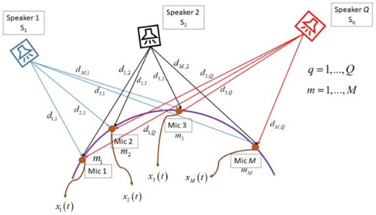 where in Equation (1), is the ideal received signal in the m-th microphone, is the transmitted sound signal by q-th sound source, is the time delay between q-th sound source and m-th microphone, is the distance between q-th sound source and m-th microphone, is the additive Gaussian noise in the m-th microphone, M is the number of microphones, and Q is the number of sound sources. Figure 1 shows the near-field model for the speech signal propagation from sound sources to the microphones.