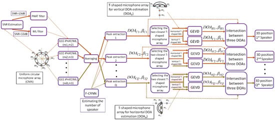 The block diagram of the proposed 3D multiple simultaneous SSL algorithm based on T-shaped circular distributed microphone array, adaptive GCC-PHAT/ML, and GEVD algorithms.