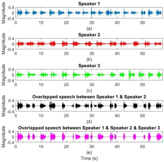 The time-domain speech signal for (a) 1st speaker (S1), (b) 2nd speaker (S2), (c) 3rd speaker (S3), (d) overlap between speakers S1 and S2, and (e) overlap between speakers S1, S2, and S3.