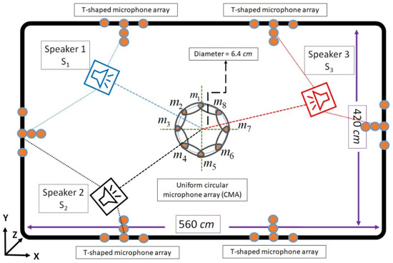 In addition, three speakers are located in the fixed positions in the acoustical room. The first, second, and third speakers are located at S1 = (115,327,183) cm, S2 = (13,684,165) cm, and S3 = (461,245,174) cm, respectively. The speakers’ locations are selected in a way for evaluating the proposed SSL algorithm at different angles in the room. The proposed DMA, which is the combination of eight microphones circular and T-shaped arrays, is an important step for preparing the proper signals for the proposed TCDMA-AGGPM algorithm. The inter-microphone distances are adjusted as d = 2.4 cm for avoiding the spatial aliasing between microphone signals in the proposed algorithm. In addition, six T-shaped microphone arrays with five microphones in each one is installed on the walls. Since the T-shaped microphone arrays play the main role in 3D SSL algorithm, the best places on the walls are considered for the installation and covering all room angles. Figure 5 shows a view of the simulated room with the speakers’ locations and microphones. In addition, the exact location of microphones and speakers with room dimensions are reported in Table 1.