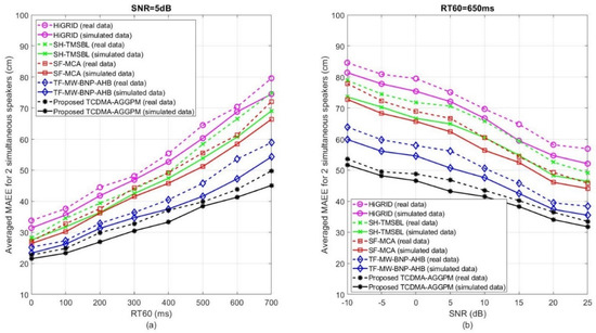 The averaged MAEE results (in cm) for the proposed TCDMA-AGGPM algorithm in comparison with HiGRID, SH-TMSBL, SF-MCA, and TF-MW-BNP-AHB methods, for 2 simultaneous speakers on real and simulated data, (a) for and , and (b) for and −10 dB ≤ SNR ≤ 25 dB.