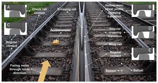 Figure 1 presents a crossing panel with the main components labelled and examples of contact conditions for different wheel profiles in transition. The examples of wheel–rail contacts concern a vehicle passing through the crossing panel in the facing direction in the through (straight) route as indicated by the arrow at the bottom of the figure (trains coming from the opposite direction travel in the trailing move). The branching track to the right is the diverging route. Regular wheel–rail contact conditions experienced by wheels on each rail side before the transition are illustrated with cross-section details C and E. As the vehicle moves further towards the crossing, for the wheel on the right, the transition from wing rail to crossing nose (detail D) will be associated with an impact load on the crossing nose. This is due to a change of direction in the vertical wheel displacement trajectory from a slightly downward motion while rolling on the wing rail to a slightly upward motion on the crossing nose. If the wheel is hollow-worn (concave tread), the given transition occurs later (detail B) and it usually causes much higher dynamic impacts compared to a regular transition. The main contact for the wheel on the left side is the regular contact with the rail, but the back of the wheel flange might come into contact with the check rail (detail A). The check rail is an important guiding mechanism to ensure that the wheelset cannot move too far to the right and make improper interference contact between the right wheel and the tip of the crossing nose.