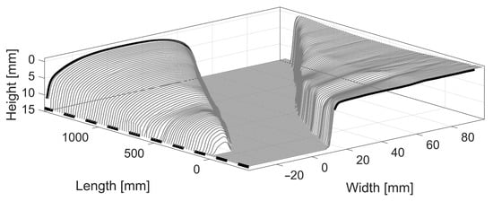 Post-processed, 2D, cross-section profiles ready for MBS analysis, crossing panel VAD 131. The longitudinal spacing between profiles is 10 mm. The crossing nose is to the left in the figure and the wing rail is to the right.