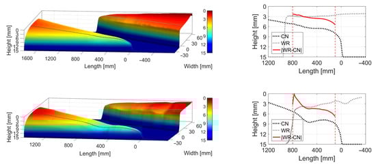 Two examples of the post-processed, scanned crossing rail geometries are presented in Figure 5. In the figure, the dotted lines that intersect the crossing nose and wing rail surfaces are representative estimations for the lateral wheel–rail contact positions. The subfigures on the right show the extracted height profiles and their absolute difference in the approximated transition region.