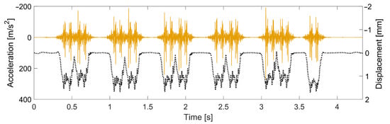 One example of a recorded acceleration signal and the corresponding reconstructed displacement signal is shown in Figure 6. The displacement reconstruction is performed using the method presented in []. It is based on frequency-domain integration, an optimization of a high-pass filter frequency, and a reconstruction of the displacement under each bogie passage with respect to an assumed “at rest position” for the unloaded track between bogie passages.