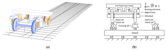 (a) MBS model of vehicle–track system, and (b) 2D representation of vehicle–track system during a passage through the crossing panel.